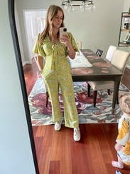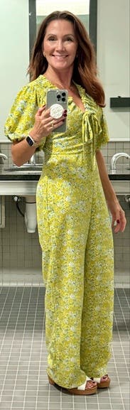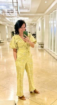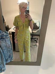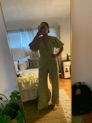 This jumpsuit is so comfortable!!!! I also love the neckline and sleeves. Here for the drama of those sleeves! I do think the leg shape and length wasn't super flattering in my 5'1" frame, but I think on someone taller it would be great. The other thing was the pocket bags kept flipping to the back which was a little frustrating but overall it was a fun style and I'm glad I rented it.