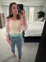Such a cute lil spring sweater. It’s a little scratchy and def a crop- I’m 5’2 and it was above my bellybutton. But the colors are so fun and it was a very flattering shape.