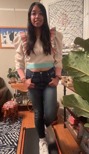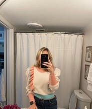 This sweater was a perfect fit and great for just about anything! It is very short, so I styled with high waisted jeans. Loved the colors and ruffle detail. Will rent again!