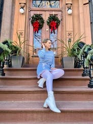 Style with the matching sweater and the William Blouse from LoveShackFancy, and the Misty Boost Quilted Shoulder Bag from Danse Lente.
