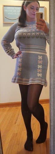 A sweater mini skirt. The paradox of skirts. Way too cold to have that much bare skin, but would be way too warm in the summer. So, I wore it with tights and thanked the lord I'm in Kentucky where we don't have snow until at least January. I love this skirt! I'm buying it new and on sale for half off in a couple days with the matching sweater. The skirt fits me perfect and is stretchy so it will fit any body shape I think. I'm busty. A top heavy hourglass according to my measurements. My hips aren't over 9" bigger than my waist or the same size as my shoulders, so I'm not a true hourglass. My waist is 31", I'm 5'5, 158 lbs (and losing), and a 38" hip. The size I ordered fits like a glove without giving me a muffin top. I wore it high Waisted at my belly button. The hem hit mid thigh. I'm proportionate in length. It's a nice thick knitted skirt with intarsia knitted design. Adorable with a slight flounce hem. I recommend for even curvy girls. However, be aware that I have had 3 sections and the shape of my pooch shows it. That little curve of the bottom belly showed up loud and clear even with light control spanx panties. It wasn't anything that bothered me too much. Pairs well with tights and the matching sweater for cooler weather.