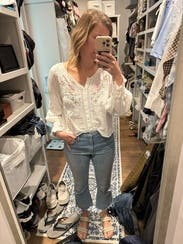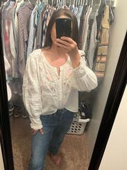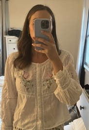 Love this flower-embroidered blouse love shack fancy. Perfect with denim or cords for fall transition. So many compliments!