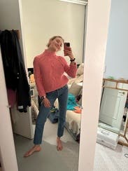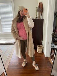 It’s a warm sweater but it’s got a loose knit so I had to layer a cami underneath. I loved the color and thought it fit my third trimester bump well! Def not oversized like on the model