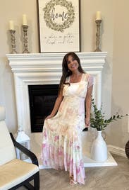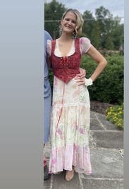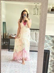 Wore this dress to a work Boho themed party in the summer and it looked stunning in the sunset! The colors are so dreamy, and the material is so soft. I also liked the neckline with the lace details. It runs a little loose, I am usually size 2 but I wore a zero and it was great!