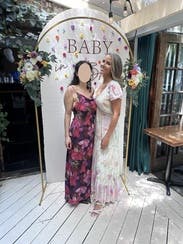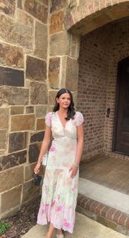 This dress was perfect for a garden baby shower. I was 2 months postpartum and the empire waist and loose draping fabric was perfect. The dress has a substantially deep v-neck so I wore a bralette for support and coverage. Im 5’7” and wore a 2.5” heel, the slight high-low hemline did not touch the floor.