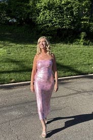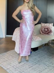 This was such a beautiful, shimmery, and show stopping dress. The color is really nice and super fun and unique for an elevated event. It fit like a glove and was comfortable the whole night of the wedding. I was worried it would be too big in the bust area but it has stretch to it as well as an inner elastic piece that goes down to right below the chest. Makes it easy to not need to wear a bra. The hip area could’ve been a tiny bit tighter (my body type is straight) but I actually preferred that it wasn’t so snug and difficult to sit or move in. It does get more snug in the legs so it isn’t the easiest to walk up large steps. The inner lining is a thicker material plus the outside sequin layer is heavier so it was very hot at the destination wedding I wore this to, but it doesn’t show any sweat. I’m petite so the length was perfect for me and hit right above my ankles. Overall loved the dress!