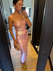 Felt like a mermaid in this! Definitely an attention grabber/conversation starter. If you have a larger bust I might recommend one size up from your normal as there is not much stretch up top. Had to pull it up here and there throughout the night but nothing too bad, it’s expected for a strapless dress. No bra needed, has ample support!