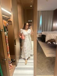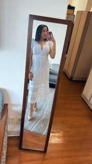 Did not like this dress when I saw it on the hanger. But when I finally decided to wear it, I loved it. The fit accentuated my figure, very feminine and curves in the right places. Even though it was long, the lace details on the bottom allowed for airflow, making it comfortable to wear in this hot Texas weather. Also, the top is not too tight if you’re a D cup. This seems to be a problem with many of the dresses that I rent causing me to wear a cami under or not wear the dress at all.