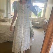 Obsessed with this dress - the shape, the colors, the shoulders, and lace detailing. So gorgeous and comfortable. I rented for wedding dress shopping and was so comfy and cute I wore it 2 days in a row!