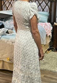 Delicate lace trim and tiny florals come together in flawless cottagecore fashion in this puff shoulder midi dress by LoveShackFancy.