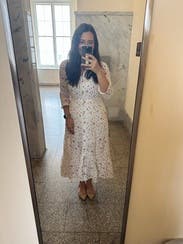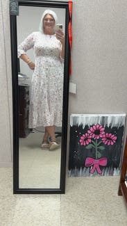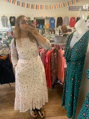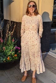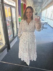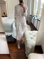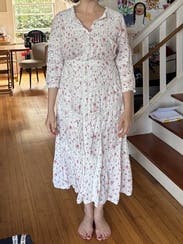 At first I didn’t love this dress as it had Little House on the Prairie vibes, but I wore it anyway and got so many compliments from people much younger than me. It’s lined and fit my pear shape but I wore a slip under it as the liner covers to upper thigh. Size up if your between sizes.