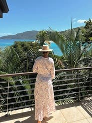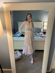 This dress was DREAMY- I simply do not want to give it back. I wore this on vacation and absolutely loved it- it’s lightweight and super breathable. I’m petite (5’1) and it hit slightly above my ankles (I was able to wear it with flats- for taller girls this would likely be a true midi). I personally find that sometimes LoveShack can run small- so I usually tend to size up (I can flex between a 2-4 depending on the brand and the fit)- I went with the 4 here and had a little bit of extra room without it being too big- it fit exactly how I would have wanted it to fit! I would wear lighter colored undies just given the gauzey/lightweight feel and color of this dress. This is a must rent!