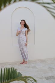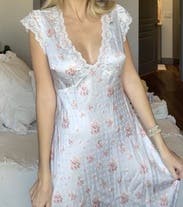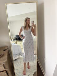 The LoveShackFancy Theodore Slip Dress is a charming floral slip with a V-neckline and short sleeves, offering a feminine and flowy silhouette. It’s perfect for a casual yet polished look, ideal for warm-weather events.