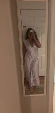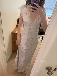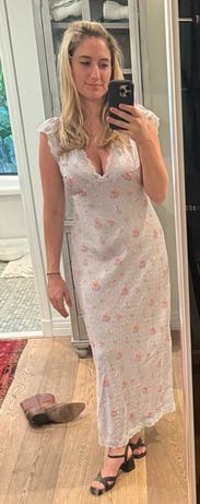 was not expecting to love this and wear this as much as I did! Wish I sized down a pinch (I rented a 10 and wish I did an 8) but still it was sooo darling and I received so many compliments!!! love how light and airy it feels perfect for hot summer days. A little bit low cut but I like to show off the girls 🥰