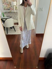 So many compliments! Fits perfectly, literally like a glove. Flows when you walk. If it wasn’t so pricey I’d get it. Easy to style with a jacket , style down with a jeans jacket or cover.