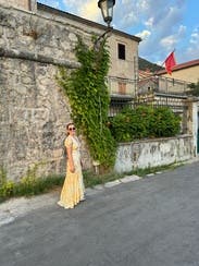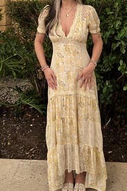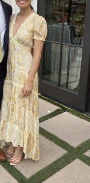 Stunning dress from LoveShackFancy! Back high/low is a bit long for my at 5 2” with 1in heels, still workable. Only thing stopping my from outright buying the dress is the fabric is surprisingly inexpensive considering the listing price. To wear/rent, it is an enchanting Belle/Beauty and the Beast dress and I am in love 💛