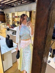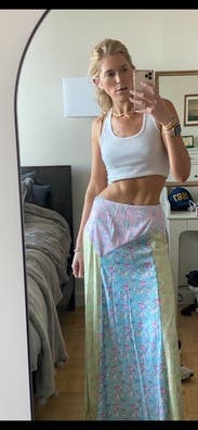 I loved the feel and fabric of this skirt - felt very high quality and luxurious. It was really long on me though - would have to pick it up when I walked. I’m sure anyone over ~5’5 would have an easier time. I also could have sized down and I think it would have sat a bit higher that way - is a bit on the bigger side. I rented with the matching top but found they were a bit busy when worn together but were stunning on their own!
