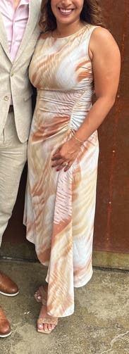 Wore this to a welcome reception for a wedding. At first I was worried it was too white but wasn’t an issue. I loved the waistline, was very forgiving.