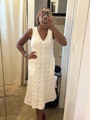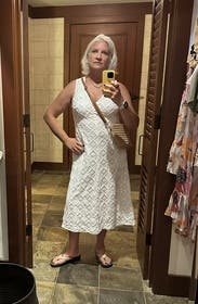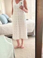 Luxely’s Sleeveless Midi Dress keeps things light with a soft shape and eyelet texture. Pair it with block-heel sandals and a raffia crossbody for an easy daytime look.