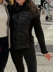 Perfect base layer with a winter vest or day/evening sport sweater look with jeans or black leggings Runs fitted and “small” — but accurate size as a slim fit layering item Wore it in Michigan and Florida This is not a coat Only the front is puffy Perfect for you if you like to live in sportswear !