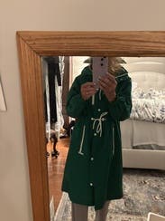 I love the bright green contrasted with the white accessories. It's easy to make the waist smaller (as in my picture) and the sleeves in the medium size are just right. I wore it on a boat trip on a vacation and it was perfect for the wind. I'm looking forward to trying it in some April showers!