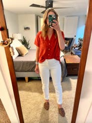 This button up has a boxy shape to it but I thought it was cute. Not very long but also not cropped, was the perfect length to tuck in just the front. Easy top to pair with things.