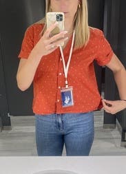 I liked the style and color of this shirt, but it was way too short. I tucked it in my high waisted jeans and it kept popping out. A great everyday top if you aren't as tall!