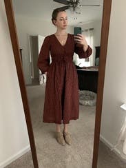 This dress is comfortable, has pockets, and accentuates your natural waist. The color is kind of brick brownish red (not my favorite) but I still loved it,
