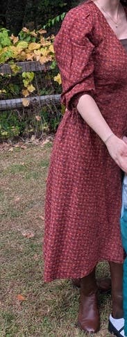My 11 year old said “It gave Evermore.” A compliment indeed! The ruching at the waist and full sleeves made this one fun. Fabric is light enough for a warm day, but the pattern is all fall-winter.
