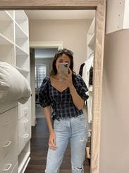 Blue plaid cotton (100% Cotton). Top. Short sleeves. Sweetheart. Tie closure. 19" from shoulder to hemline. Imported.