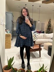 Rented this up one size for the third trimester, but I think my normal size M would have been fine too as it is very roomy through the midsection. Super cute with tights.