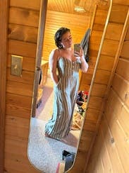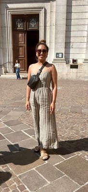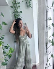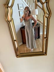 Type: Hate wearing bras, small chested; curvy bottom. Mom belly. Pros: 1. adjustable straps. 2. Didn’t have to wear bra. 3. Vertical stripes and wide legs are flattering. Cons: doesn’t pack well and wrinkles fast. I’m 5’5” so it hit right above my ankles. I wore this for day-touring in Europe and for West Coast Swing dancing! It was so comfortable but of course not super breathable for sweating but i danced in it all night. I also styled it for the office with a blazer and work heels. It’s so versatile. I think i could’ve sized down because of the gauze backing that allows for stretching. I’m small chested too. If the size down 4 fits well, I’ll probably buy it. You must rent this fun jumpsuit!