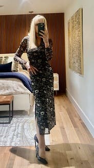 Loved this form fitting dress that I wore to a tech event. The best things about this dress are that it doesn’t creep up like some dresses - it stays down in place - and it moves with you. It is not see through (I was worried about this before getting it) except of course the sleeves. It made me feel beautiful and can be dressed up or down. Loved!