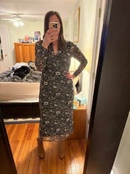 Really liked this dress and the pattern was different but cute in person. More of a green color in person! It was a little loose through the waist/hips but fit well in the bust. Could have probably worn this to work as well since it wasn’t too tight fitting , but wore out to dinner