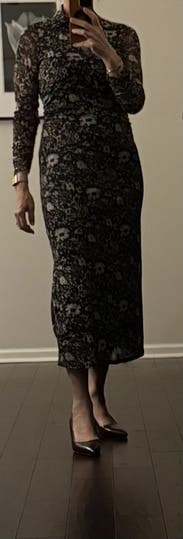 Get this dress! Very flattering silhouette, I felt great in it. Wore it to a funeral, and then for a Thanksgiving dinner event. It would have been a buy if it wasn't from Madewell (and therefore can purchase new on my own). Lots of compliments. It's also super comfy.