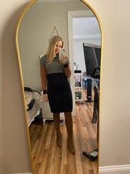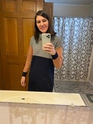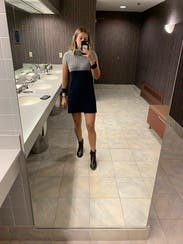 I loved the color block and sweater sheath dress style, but the length was just too awkward on my 5'2" frame. I have a pear shaped body, and the length + the non-curve hugging style just didn't do it for me. I was bummed about this one. I "hemmed" it to see if it was better 3 inches shorter, and it was much cuter (while still being very modest).
