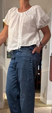 This breezy white blouse from Madewell features delicate lace detailing on the puff sleeves, adding a romantic touch to a casual look. Pair it with your favorite jeans for an effortless, everyday ensemble.