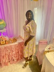 Wore this wrap to baby shower while 9 mos pregnant. Fit was great, was a little worried about the top so I did use some fashion tape but overall a very sweet look, perfect for the baby shower.
