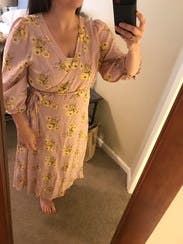 It fit well, was flowy and cute, was surprised for a wrap dress to fit correctly in the bust, but I felt like it made me look big due to its lack of structure/shape for my body type. Definitely was cute though!