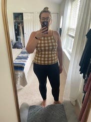 The tank was too big and too small at the same time. There is no shape to the tank so if you have boobs, prepare for lots of side boob. So much that if you move wrong your boob will just fall out the side. Imagine wearing an apron.. that's kind of how it fits on top.
