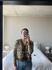 Cute cropped sweater. Wore both open as a layer (pictured) or buttoned up on its own. Looked best with high waisted pants. It was a fun one that I wore a lot. The color isn’t quite brown it has a greenish hue, what my friend calls “pond scum green”- but don’t be deterred by that name, still a great piece! Good weight to it as well, kept me warm but not too hot.