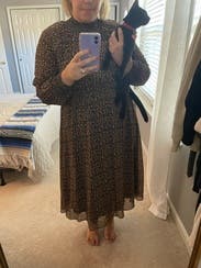 Loved this dress and considered buying it. The fabric is fun without being overwhelming, the fit is perfect, and it's a perfect vibe for fall. I wore it sightseeing and to a musical and fit right in