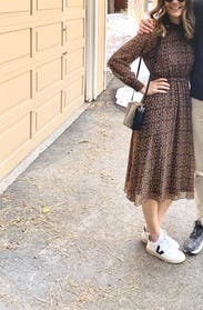 Such a pretty, feminine dress that I paired w sneakers or booties and a leather jacket. It definitely didn't fit me like the model. I'm petite and curvier on the bottom and the torso seemed just a tad short. I think I may size up to S to see if it's more comfortable, but then the skirt would be longer. And even though that would be a different look, it could still be cute