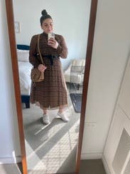 The dress is true brown paisley, and was perfect for cooler weather. There's an elastic waistband, and my only complaint was that it would bunch up a little bit from time to time and had to be pulled back down. I probably could have worn either size, but I'm smaller up top so I went with the smaller size for a better fit. I wore a regular black bra- the dress is lined and gives good coverage. If you already love Madewell you'll love this dress. I paired it with flats but there are lots of ways to style it.