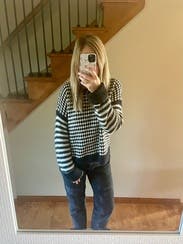 This sweater got so many compliments. I ordered a size up because I like my sweaters oversized but with this one I should not have. Very flattering and a fun pattern!