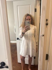 This dress ran true to size, but absolutely requires a slip underneath. I loved the detail on the edges. Easy and lightweight, but do not rent if you don’t have something to wear underneath.