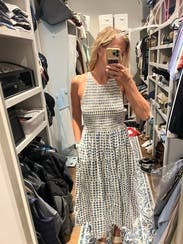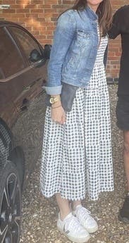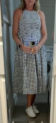 Cute dress. Dressed down with white sneakers, but could also do sandals or heels. Showed a little more side boob than I liked, but paired well with a denim jacket. Fit true to size.