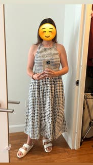 Very flattering fit but the smocking pulled tight across the front and armpits run deep. This caused a side boob situation and I was pulling it up all day. Thick smocking though so I didn’t have to wear a bra, which I loved.
