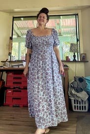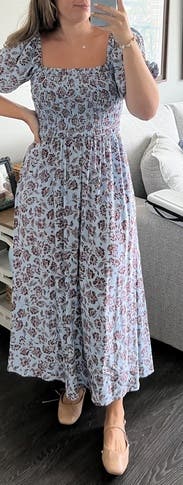 Madewell's Smocked Short Sleeve Midi Dress is a breezy, floral-print piece that effortlessly transitions from brunch to evening outings. Pair it with strappy sandals and a woven tote for a relaxed, daytime look.