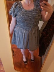 This had an easy fit and was cute! Has pockets. Smocking was a little longer than I like making it a bit unflattering on hips imo